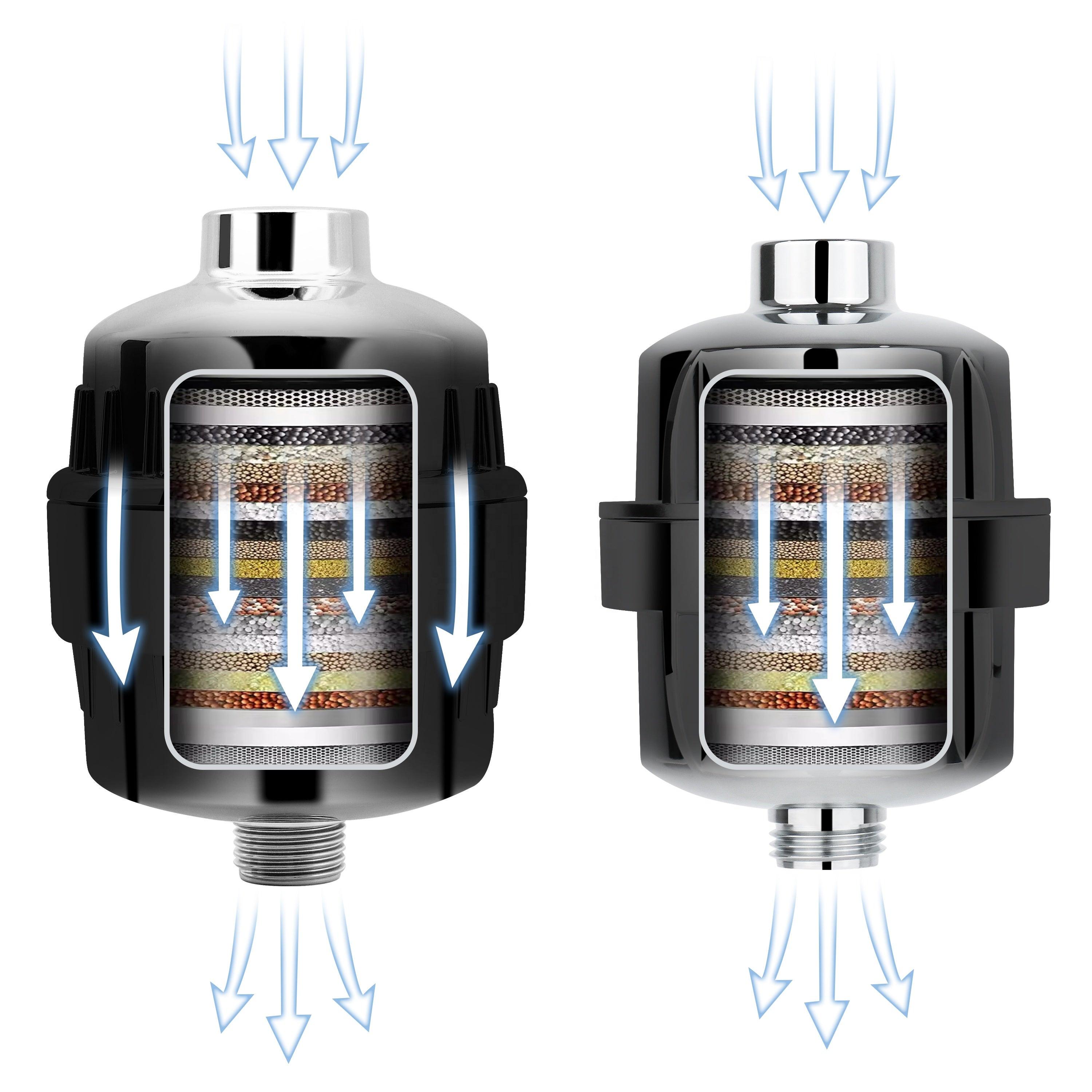 Denna utbytesinsats består av hela 25 filtreringslager, varav 19 är aktiva filtermaterial – inklusive kokosnötskol, KDF-55, kalciumsulfit, zeolit och vitamin C-kulor – som tillsammans reducerar klor, tungmetaller, kalk, bakterier och andra orenheter i vattnet.